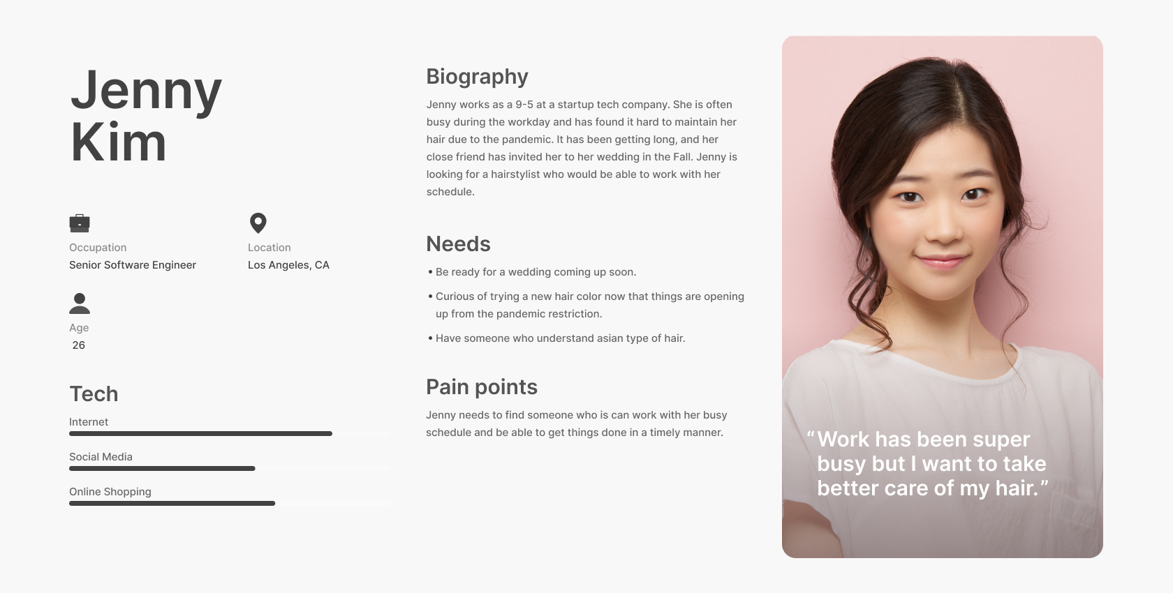 After gathering research and the findings from the surveys and interviews, I used the information collected to help define our targeted user. Creating a persona and an empathy map helps us know how the user will think and behave.